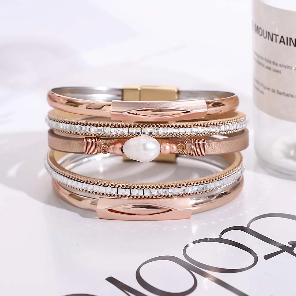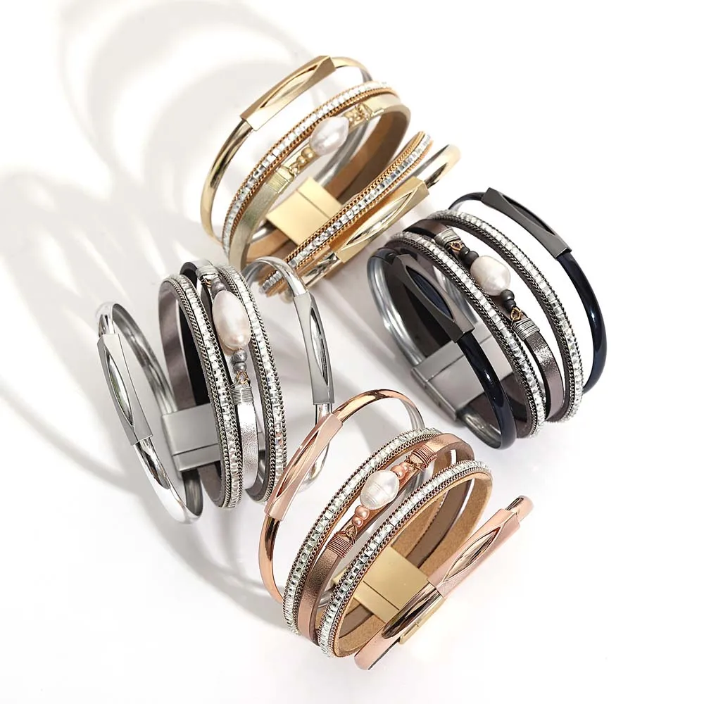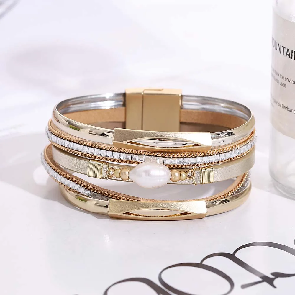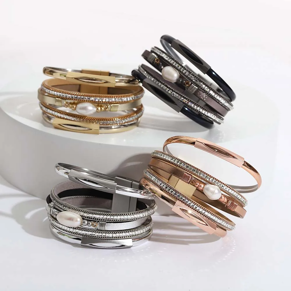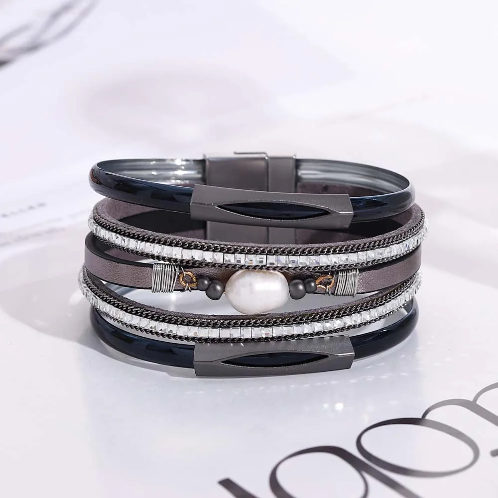 Adicione um toque de luxo à sua moda com a nossa Pulseira ALLYES, uma expressão única de jóias unissex que combina pérolas de água doce irregulares, couro de plutônio multicamadas e strass cintilantes.